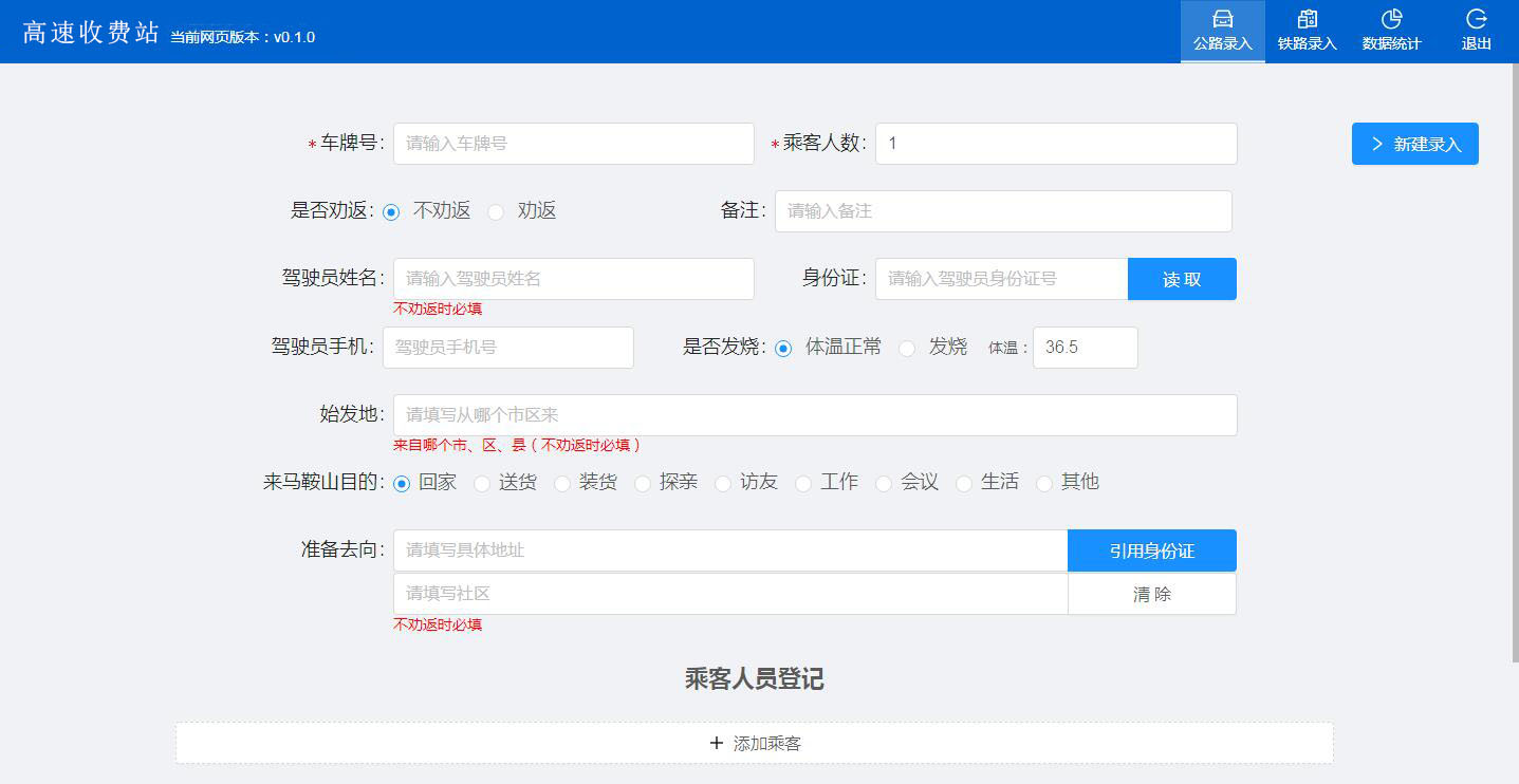 对进入本市的所有人员进行身份核验,通过身份证读取设备自动采集驾乘人员身份信息及头像信息,建立一人一档数据库,为后期跟踪核查提供精准服务,支撑政府部门联防联控、精准施策。
