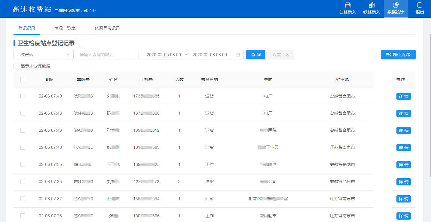 为进一步做好新型冠状病毒感染的肺炎疫情防控工作,有效防止疫情传播,确保广大人民群众的健康安全。我公司研发的疫情登记管理系统在高铁站、各个高速公路入口、重要卡口等查控点陆续投入使用。全面严格开展对进入本市人员、车辆等检疫查控,积极构建疫情防控安全网络。