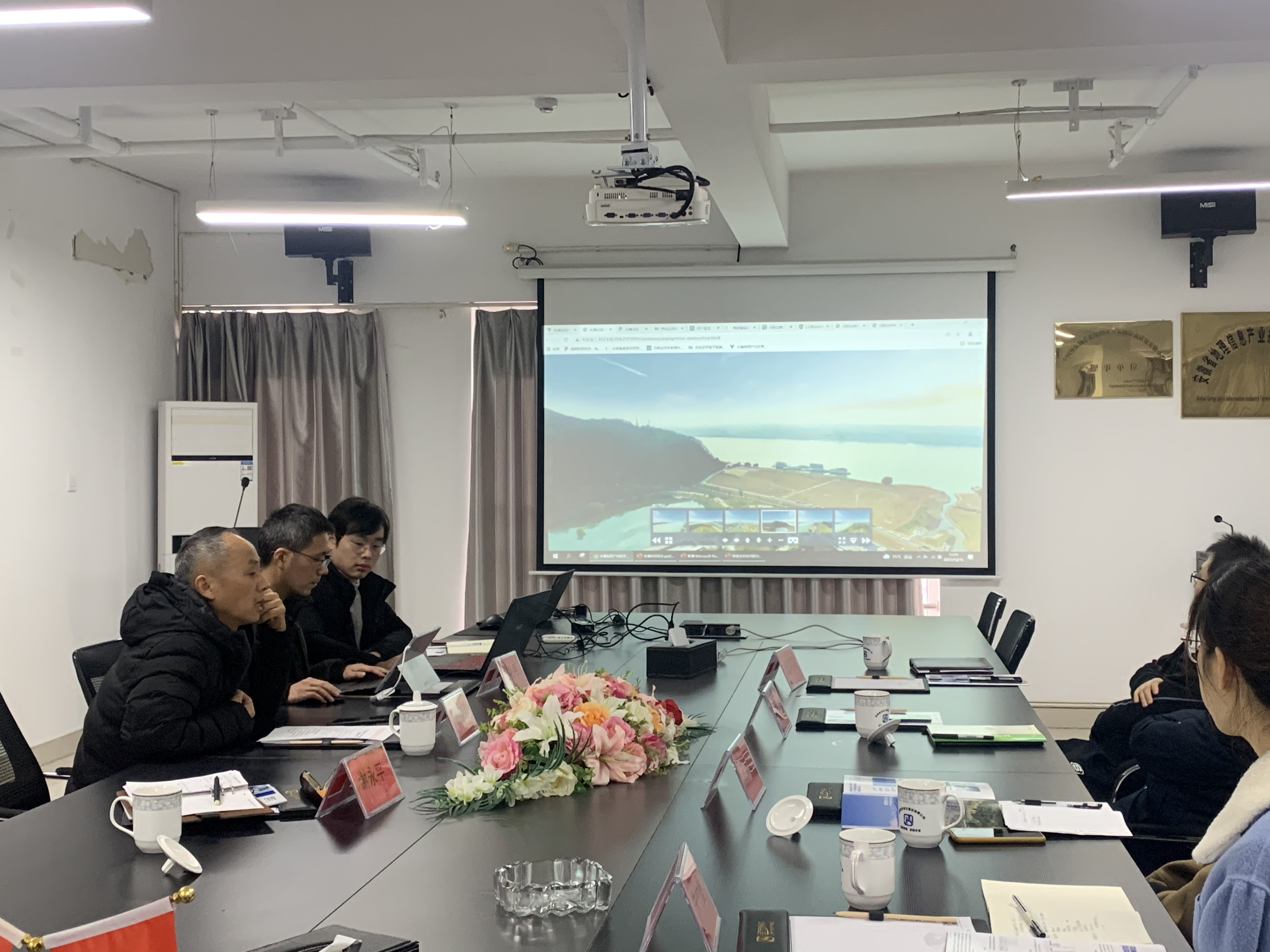会上我司副总孔毛毛现场演示平台,通过信息化手段直观展示我市长江干支流沿岸范围内项目、企业、园区、岸线、湿地、绿地等方面的地理分布及相关经济数据信息,全程展示企业关停搬迁、项目建设、生态修复等情况。并就平台建设经验和运行情况向蒋院长一行做了专题汇报,并提出对省级、市级智慧综合管理平台建设的建议。
