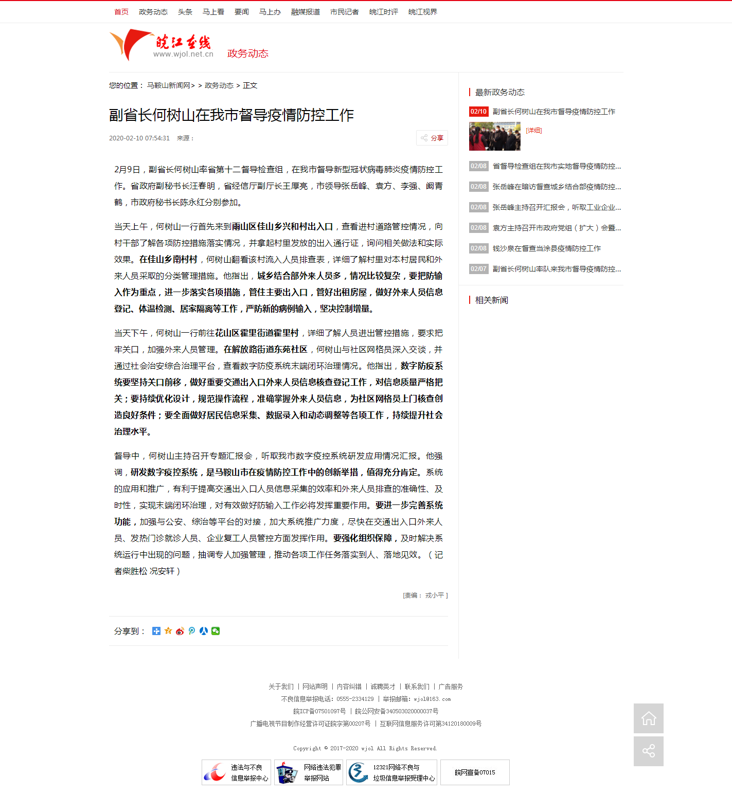 2月9日,副省长何树山率省第十二督导检查组,在我市督导新型冠状病毒肺炎疫情防控工作。省政府副秘书长汪春明,省经信厅副厅长王厚亮,市领导张岳峰、袁方、李强、阚青鹤,市政府秘书长陈永红分别参加。