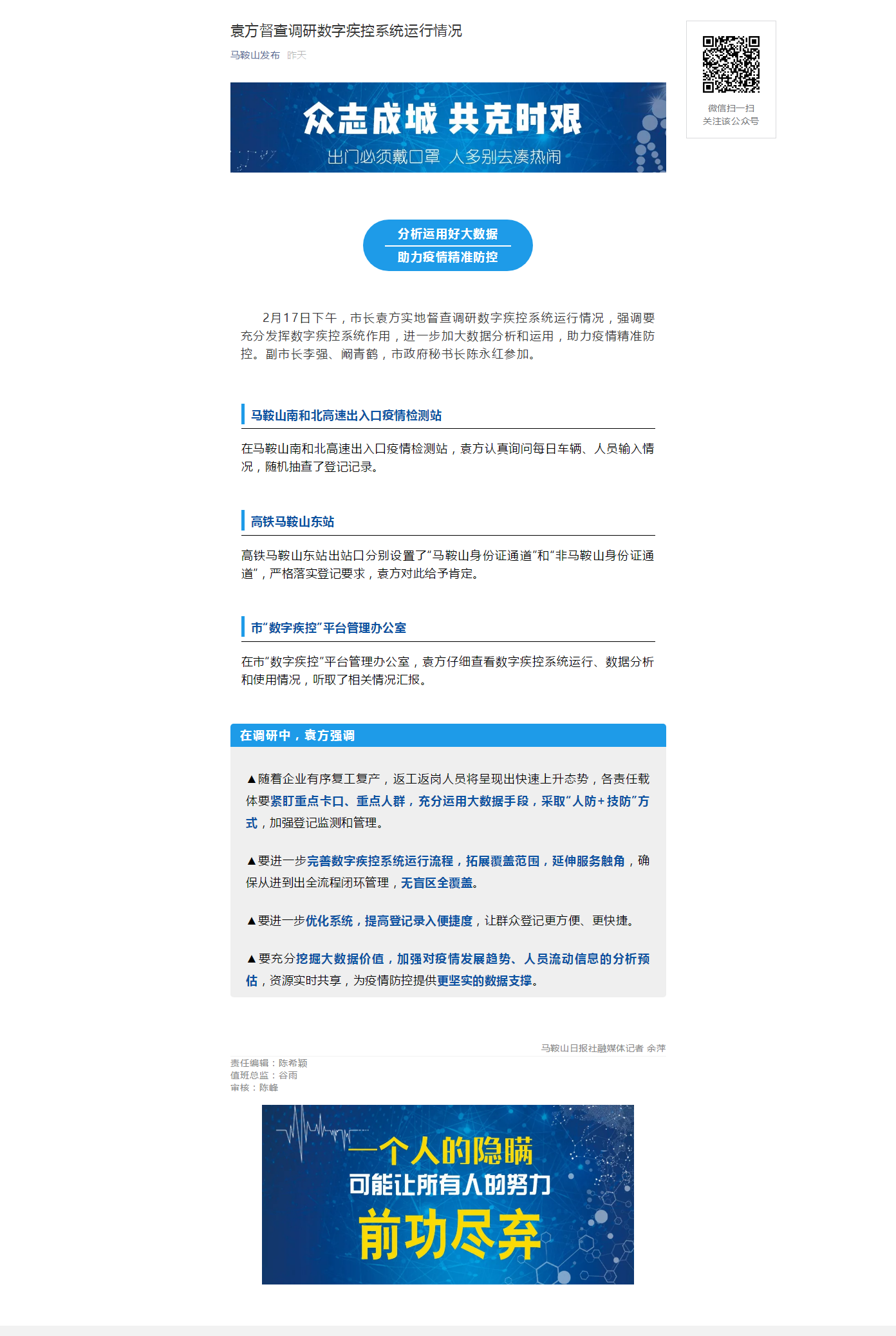 2月17日下午,市长袁方实地督查调研数字疾控系统运行情况,强调要充分发挥数字疾控系统作用,进一步加大数据分析和运用,助力疫情精准防控。副市长李强、阚青鹤,市政府秘书长陈永红参加。