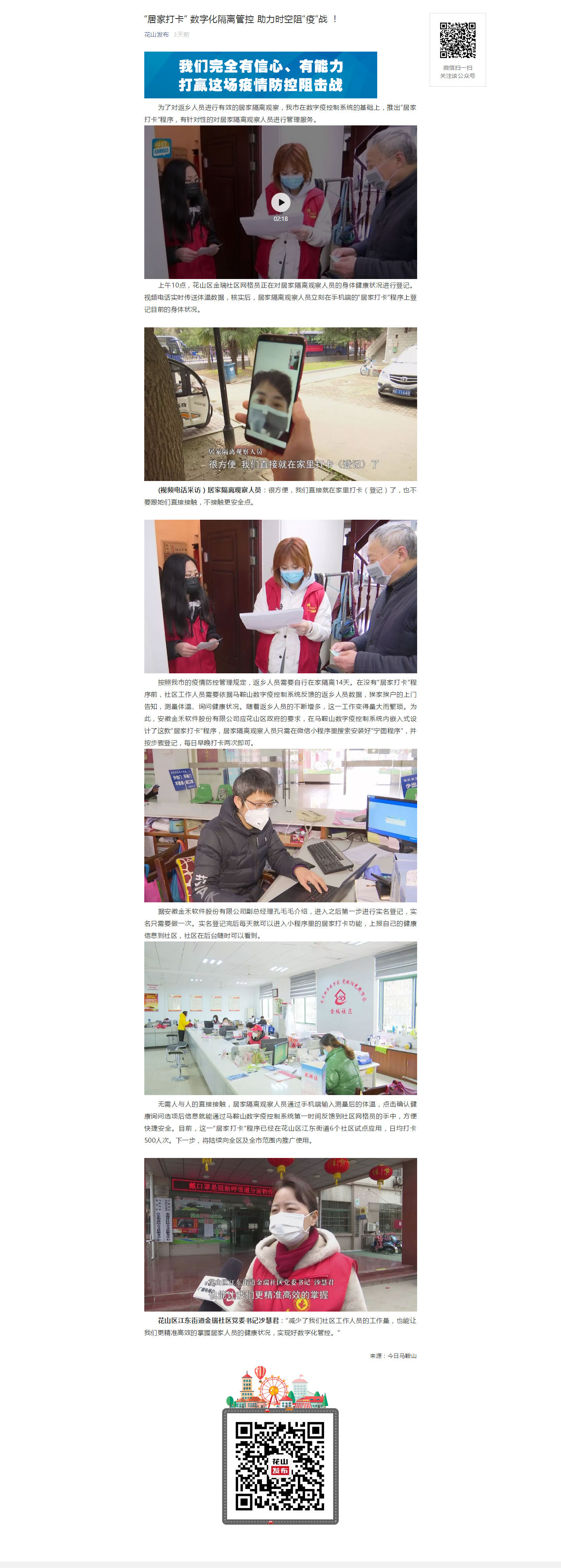 花山区江东街道金瑞社区党委书记沙慧君:“减少了我们社区工作人员的工作量,也能让我们更精准高效的掌握居家人员的健康状况,实现好数字化管控。” (来源:今日马鞍山)