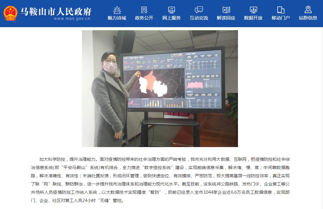 加大科学防控,提升治理能力。面对疫情防控带来的社会治理方面的严峻考验,我市充分利用大数据、互联网,把疫情防控和社会综治信息系统(即“平安马鞍山”系统)有机结合,全力推进“数字疫控系统”建设,实现前端信息采集,解决堵、慢、难;中间靠数据跑路,解决准确性、有效性;末端处置反馈,形成闭环管理,做到快速定位、有效摸排、严密防范,极大提高基层一线防控效率,真正实现了联“网”联控、群防群治,进一步提升我市治理体系和治理能力现代化水平。截至目前,该系统将公路铁路、发热门诊、企业复工等公共场所人员疫情防控工作纳入系统,以大数据技术实现精准“智防”,目前已经录入全市1044家企业近6.6万名员工数据信息,实现部门、企业、社区对复工人员24小时“无缝”管控。(摘自马鞍山日报)