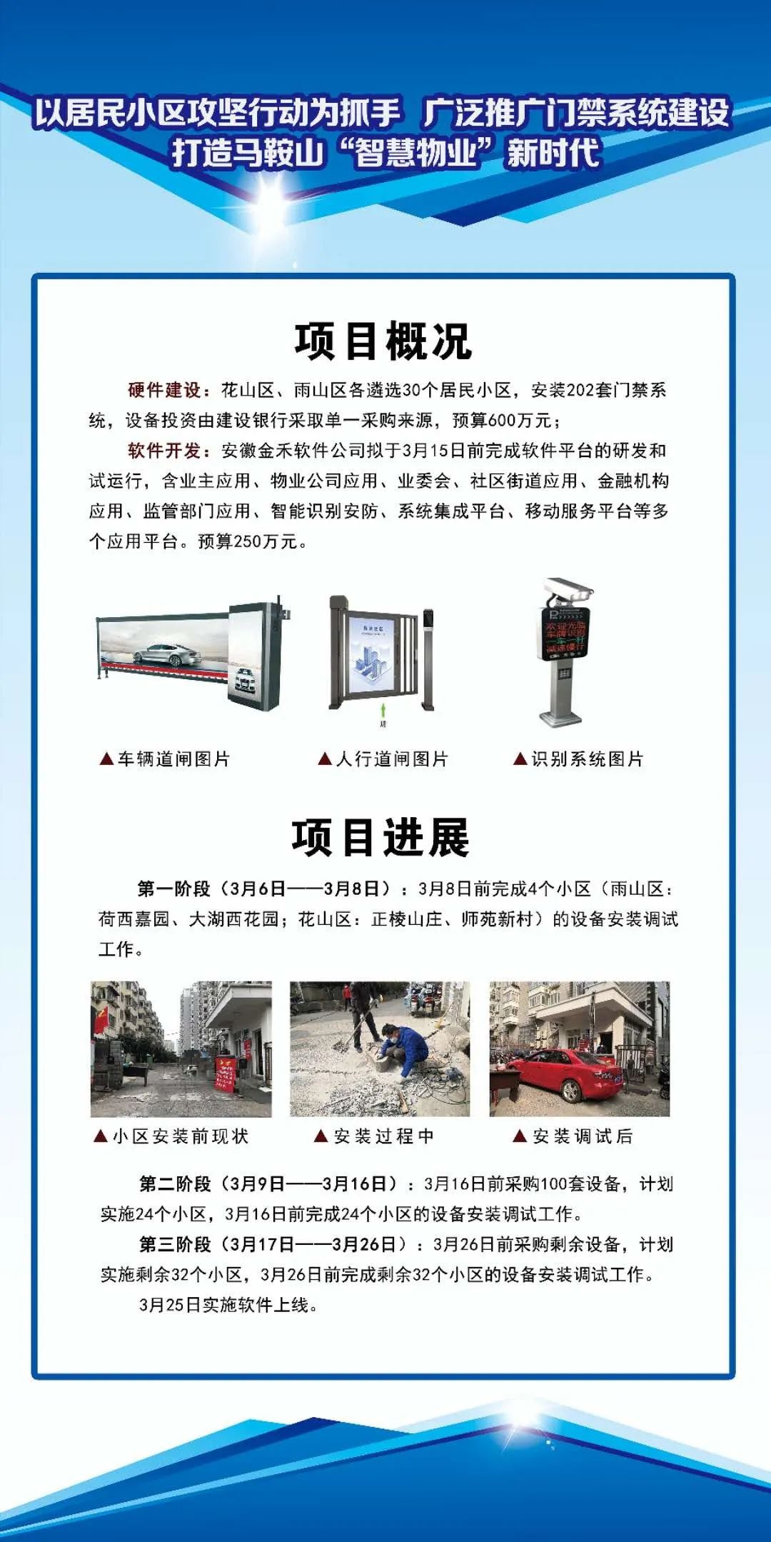 截至目前在花山区、雨山区各遴选30个具备封闭管理基础条件的小区(非新建小区和未列入2020年老旧小区改造范围的小区)安装门禁系统设施,将来本小区居民可以通过刷脸、刷卡、刷身份证、刷手机等方式自由进出小区。