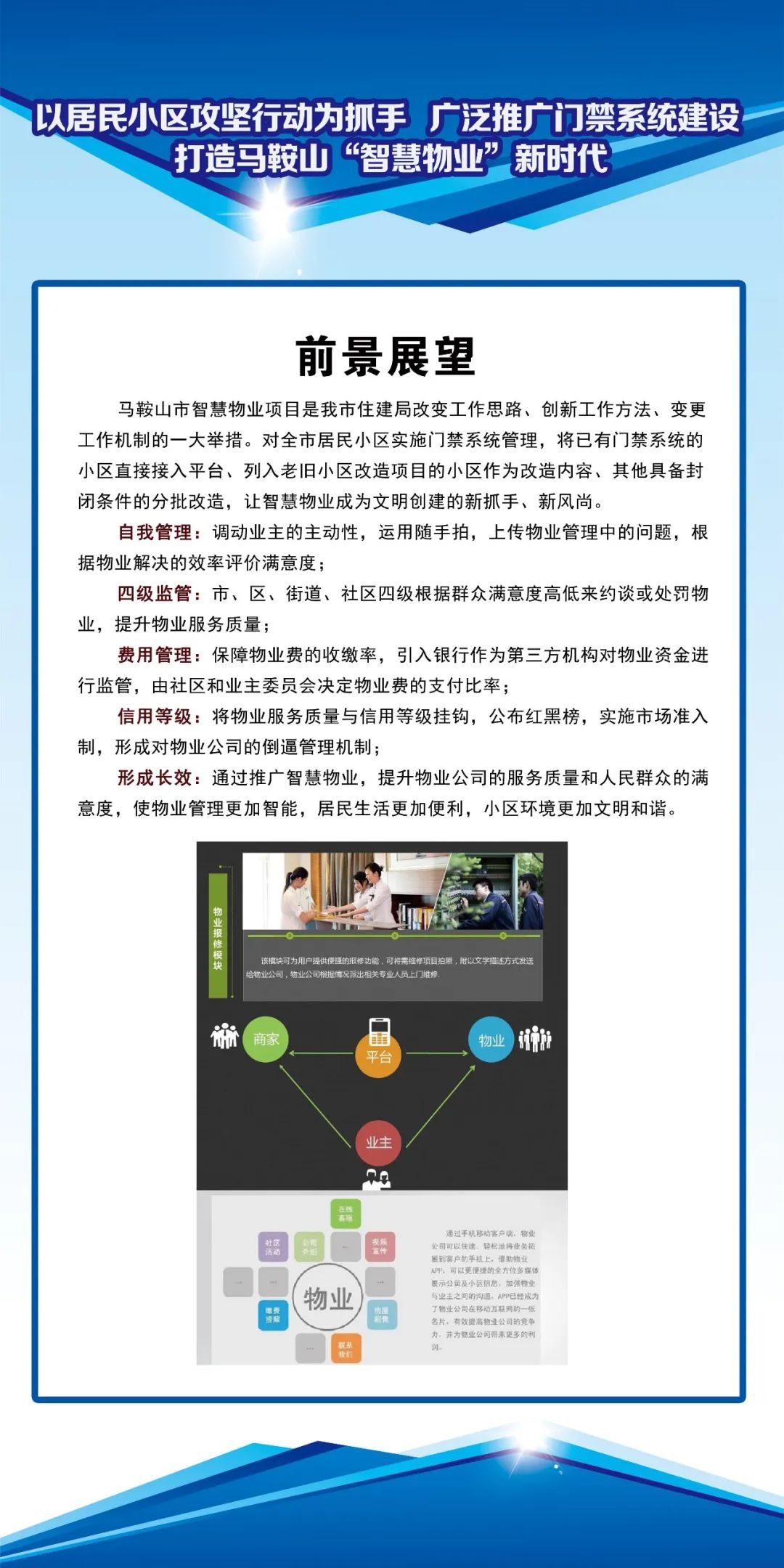 马鞍山市智慧物业建设目前正在我市部分小区推进实施当中,项目通过引入银行作为第三方机构对物业资金进行监管,将物业服务质量与管理费支取、市场准入等挂钩,实现对物业公司的倒逼管理,提升物业公司的服务质量和人民群众的满意度,使物业管理更加智能,居民生活更加便利,小区环境更加文明和谐。