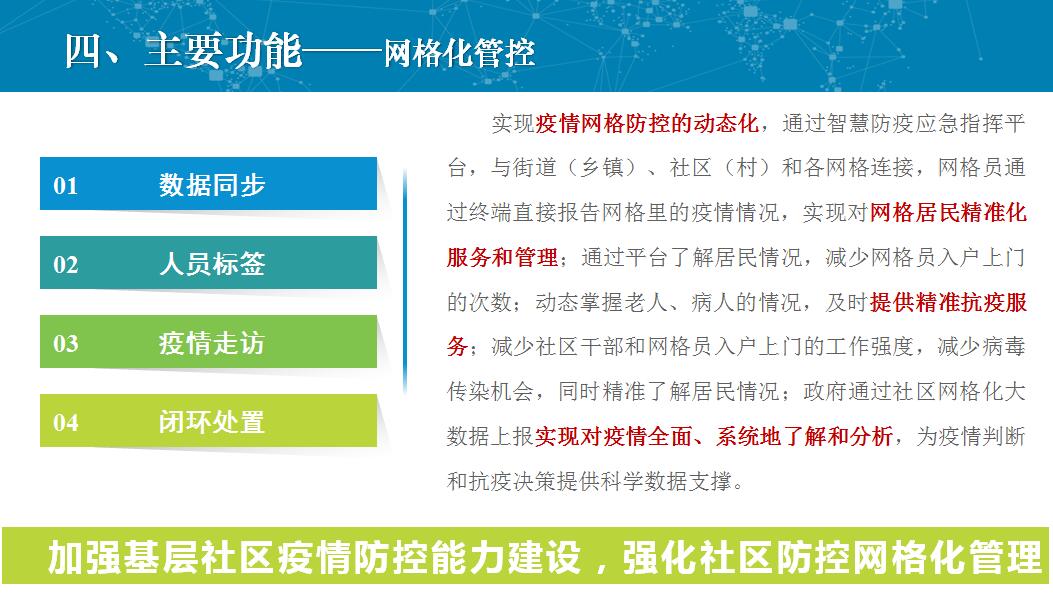 数字疫控系统是利用物联网、大数据、地理空间信息等新一代信息技术,着眼于疫情防控重点人群的全过程闭环管理,借助信息化手段提升疫情防控的“源头防控+末端治理”水平,实现从疫情登记、信息共享、数据核查、日常监测、异常处置、信息发布的数字化管控, 打造服务“人防+技防”的一体化数字疫控系统,为打赢疫情防控阻击战提供科技支撑。