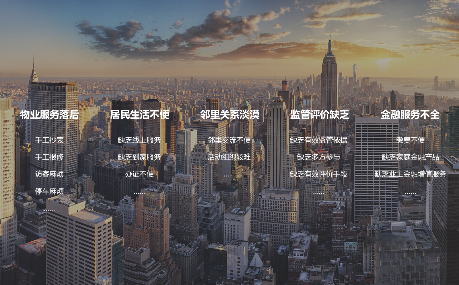 智慧社区的发展离不开智慧建设,作为城市发展进程中的中坚力量——物业行业,顺理成章的成为了智慧城市建设的重中之重,促进物业持续健康发展,国务院办公厅发布《国务院办公厅关于促进社区业持续健康发展的意见》。以智慧社区中重要组成智慧物业为依托,集业主、业主委员会、物管单位、金融机构、政府监管机构、社区等多方参与为一体。